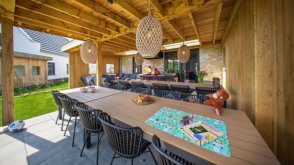 Draußen gibt es eine extra große überdachte Terrasse mit u.a. einem bequemen Lounge Set und Grillmöbeln. Auf dem Parkplatz neben dem Villa gibt es Platz für fünf Autos. Die Gäste haben Zugang zu kostenlosem WiFi im ganzen Villa.