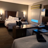 Ja, Hampton Inn Kenedy erlaubt Hunde und Katzen (max. 2 insgesamt). Es fällt eine Gebühr von 75 USD pro Unterkunft und pro Aufenthalt an. Assistenztiere sind von Gebühren ausgenommen.