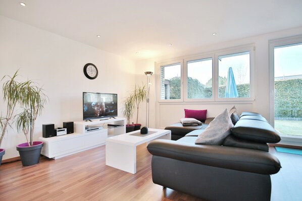 Der geräumige Wohnbereich ist mit einem gemütlichen Sofa ausgestattet. Ein Flachbild-TV mit DVD-Spieler und HiFi-Anlage sorgen für Unterhaltung.
