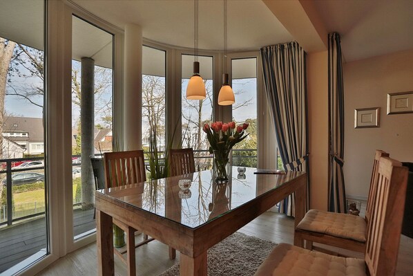 Das elegante Appartement für 4 Personen (max. 3 Erwachsene) verfügt über einen großzügigen Wohnraum mit offener Küche. Von hier haben Sie direkten Zugang auf den 11m² großen Rundumbalkon. Der Wohnraum verfügt über eine stimmige Einrichtung aus massivem Shishamholz. Des Weiteren ist ein Sofa mit Schlaffunktion (1,50m Liegefläche, Federkern), einem 42 Zoll großem LCD-Flachbildschirm TV, DVD-Player sowie einer Stereoanlage inkl. CD-Player vorhanden.