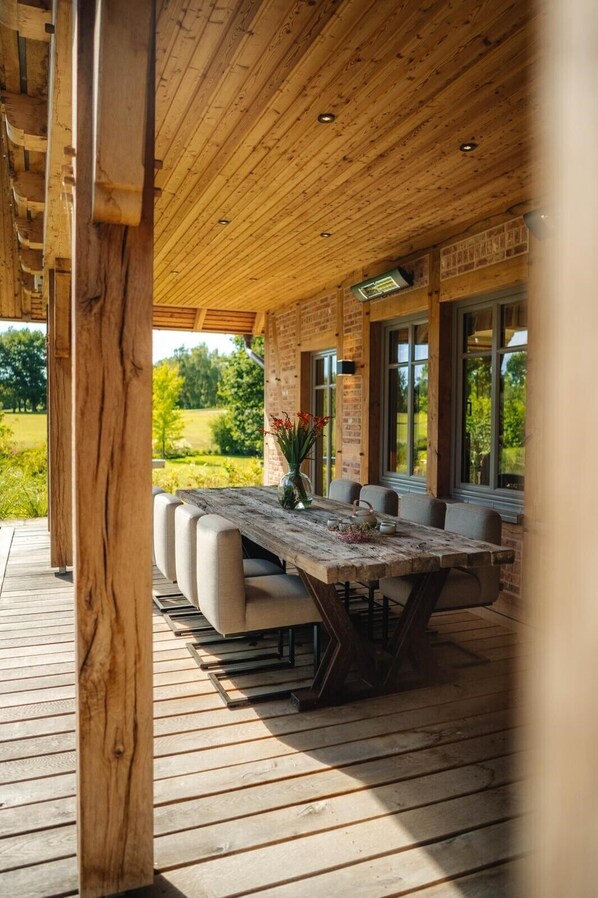 Das Anwesen begeistert mit einem eigenen Natursee samt Strand, Strandkorb, Strandgras und Wasserfontäne. Zusätzlich lädt das Federballfeld, umgeben von einer blühenden Blumenwiese, zum Spielen und Entspannen ein. Die Hauptterrasse, eine von vier, verfügt über eine großzügige Lounge und eine rustikale Sitzgruppe für acht Personen, komplettiert durch einen gemauerten Pizzaofen und einen zusätzlichen Holzkohlegrill. Bei kühleren Sommertagen sorgt der 16qm große Sonnenschirm mit integrierten Wärmestrahlern für optimalen Komfort. Dank Steckdosen und USB-AnschIüssen verwandelt sich die Terrasse in ein traumhaftes Home-Office inmitten der Natur.
