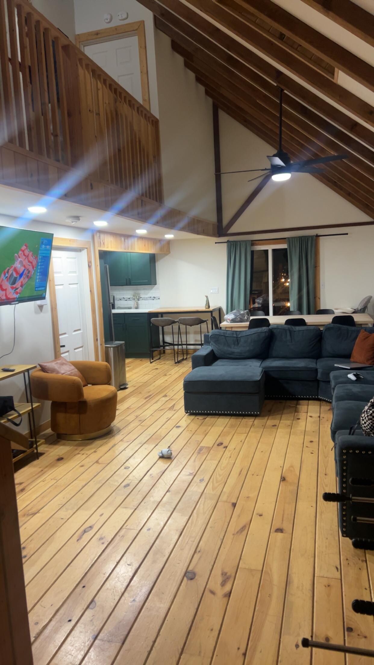 ☀ Lofty, open living room with comfy seating and games!
