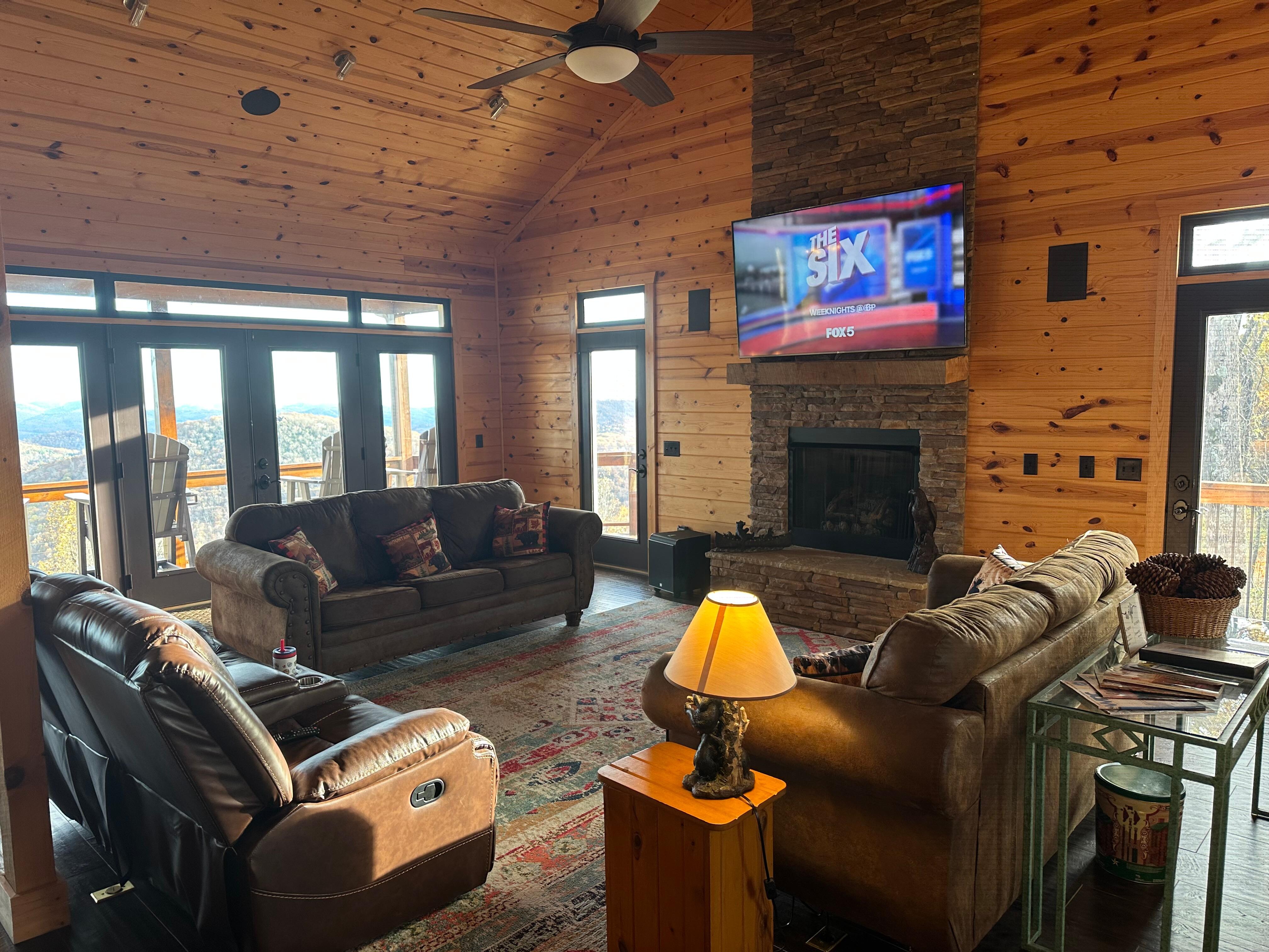 The main level features an open-concept living area with a cozy stone fireplace with gas logs, inviting you to relax while enjoying the panoramic views. The fully equipped kitchen boasts stainless steel appliances, granite countertops, and a spacious island with seating for six, perfect for casual meals or morning coffee. A dining area with seating for eight provides the perfect setting for family dinners. The master suite on this level offers a luxurious king bed, large flat-screen TV, and an en-suite bathroom complete with a soaking tub and a step-in shower with a rain head. Step outside to expansive covered and uncovered decks, where you can take in the fresh mountain air and admire the picturesque surroundings.