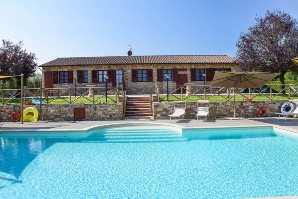 The property lies in a hilly and quiet location at 6 kms of the well known city of Todi. From the property you can enjoy a beautiful panoramic view on the landscape and Todi self (you can also see the church Santa Maria della Consolazione). The property features a large private garden of around 6000sqm meter with a 12 by 6 meter pool. The whole property is for private use of the tenant (not shared with other holiday makers or owner). On the west-southern side there is a big and well maintained lawn, nice to let the children play football or run freely in the garden. Next to the house and lawn there is an equipped area to cook outdoor with barbecue and outdoor oven. There are also tables and chairs for outdoor dining. The pool lies on the north-eastern side of the house, from here you can enjouy the panoramic views on the landscape and Todi. The pool is 12x6 meter with romain steps. The depth is overall 135cm. The pool area is equipped with sun loungers, garden chairs and sun umbrellas. There are also tables and chairs on this side of the building to eat outdoor. The property is suitable for 10 persons and there is also a baby cot available. The house is subdivided into 3 apartments. Each has a living/ding room with kitchen, 1 or 2 bedrooms, bathroom. The smallest is suitable for 2 persons. The second one has 2 bedrooms, one with double bed and the other has a single bed (it's possible to add here an extra bed). The biggest one has 2 double bedrooms. The 3 apartments have all fridge, cooking corner, oven, TV, toaster, american coffee machine and Wi-fi internet connection. There is a washing machine in one apartment. Shops and supermarkets are all available at 6 kms in the city of Todi. The nearest restaurant is at 1,3 kms from the property (Trattoria Cibocchi), many more available in and around Todi.