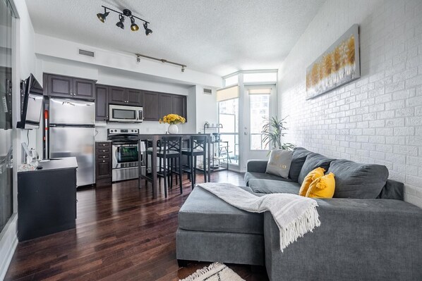 Welcome to our newly renovated apartment located in a boutique building in the heart of trendy Downtown. 1 bedroom + Den unit is perfect for families or big companies or working professionals. The apartment is located steps away from Toronto's best restaurants, shops, and entertainment. This bright unit has floor to ceiling windows, an open concept layout, and high end furniture chosen by an award winning interior designer.