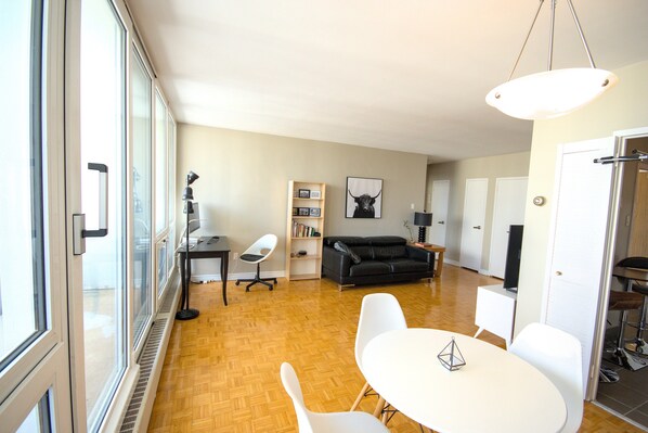 Bathroom and kitchen faucets & shower were upgraded recently. The bedroom comes with a Queen size bed with a paediatric mattress (one side softer, one side firmer). Laundry located in the building and costs 2.50$/load. The bicycles pictured are my personal and do not come with the rental. Large closet in the bedroom and entrance areas, (two smaller closets in living room will not be available).