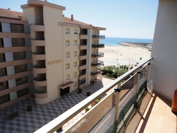 Wohnung vor dem Meer von 60 m2 im 4. Stock mit Aufzug. Es hat 2 Schlafzimmer (eines mit Doppelbett und eines mit 2 Einzelbetten), 1 Badezimmer mit Dusche und eine voll ausgestattete Küche. Es hat auch eine Klimaanlage im Esszimmer, Balkon mit Meerblick und Gemeinschaftsbereich ohne Schwimmbad (es gibt eine Dusche, um den Sand vom Strand abzuwaschen). Es hat auch Wifi und einen Tiefgaragenplatz. Zur Wohnung gehören auch Bettwäsche und Handtücher.
