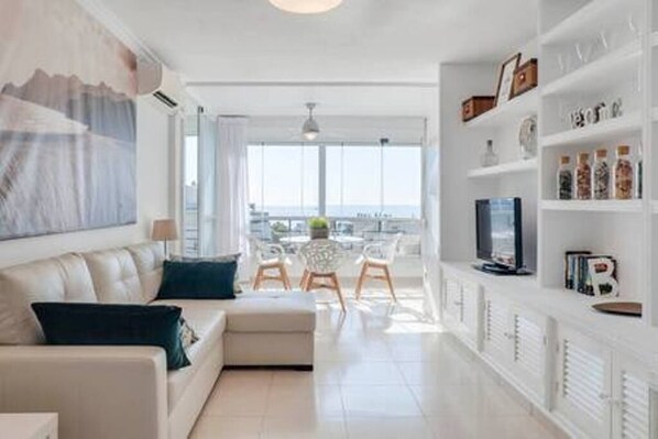 Das gesamte Wohnzimmer lässt sich dank seines Glasfensters ohne Profile (Lumon-Glas) leicht in eine große Terrasse verwandeln und im Winter können Sie bei niedrigen Temperaturen den freien Blick auf das Meer bei geschlossenem Glas genießen.