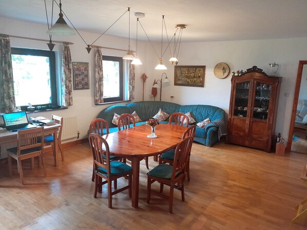 Inside: This is a beautiful quiet bright cosy cottage, with gorgeous views. You walk into a large dining/seating room with great views of the lake (and also the Donkeys) from all the windows. This is a great space for all the family to enjoy. There is a beautiful stove and a small library of English and German language books to enjoy.