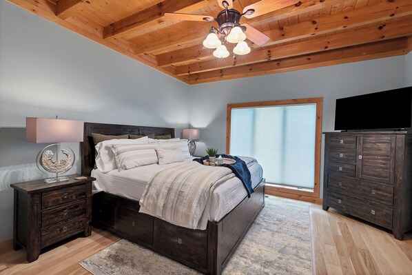 This newly appointed post and beam three bedroom three bath retreat checks every box for your perfect Smoky Mountain getaway. The open Great Room consists of a fully equipped gourmet kitchen with stainless appliances, granite counter tops, and custom cabinets, that opens to a spacious living room with a floor to ceiling wood-burning fireplace, oversized flat Smart TV, reading area, and a wall of windows facing a beautiful mountain view. Enjoy family meals together at the large banquet table, as well additional seating at the adjacent kitchen bar. Outdoor gathering space is bountiful with a large screened porch and open deck, complete with patio furniture and outdoor gas fireplace and gas grill. There is a King bedroom on the main floor, which is adjacent to a full bathroom with tub and shower combination. Upstairs features a large King bedroom with an en-suite bathroom, that also has a walk-in shower and whirlpool tub, facing mountain views. A hidden children's room is accessible through this bedroom and provides four Twin size beds. The loft area provides a quiet reading nook that has a Queen size sleeper sofa. The bottom level provides a large den, game room, mini-kitchen, gas fireplace, and a third bedroom with Queen size bed. There is another large Smart TV in the Den comfortable sofa and love seat. There is also another covered deck with private full size hot tub and patio furniture. This home is ideal for guests that need access to everything on the main floor without steps, including a bedroom, full bath, kitchen, dining area, and living room. Guests of this property may enjoy access to the swimming pool and 24 hour fitness center for a small fee, which is located at the Wild Laurel Golf Course, less than three minute drive from this home. Please note, for your health and safety, this property is a Non-Smoking property both indoors and outdoors. While staying at this home, guests will have access to the Wild Laurel Fitness Center at NO charge, and access to the swimming pool for a small fee.