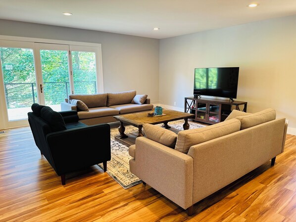 The main level is a large format open floor plan with plenty of room for relaxing in the main living room which hosts lots of seating and a smart TV to link to your preferred viewing platforms. WiFi included. The main level kitchen is well equipped with all new appliances, plenty of prep space, a pantry for all your goods & a large island and dining table to gather & enjoy. Two refrigerators, the extra in the lower level, to keep all your extras cold. The coffee & beverage station in perfect for easy access for you and your guests.