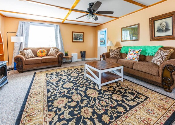 Unwind after a busy day in the park on a comfortable couch and chairs while enjoying the warmth of the electric fireplace or the coolness of an air conditioner. The room is filled with natural light from the large windows, and the ceiling fan provides a cool breeze on warmer days. A Smart TV is available for entertainment, and there is a selection of books for those who prefer to unwind with a good read. The living room also features a stylish coffee table and a comfortable rug, creating an inviting atmosphere.