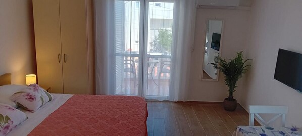 Genießen Sie die Bequemlichkeit eines privaten Außenparkplatzes und eines entzückenden Balkons mit Außenmöbeln, ideal zum Genießen des Morgenkaffees oder zur abendlichen Entspannung. Das Studio ist mit modernen Annehmlichkeiten wie Klimaanlage, WLAN, einem Flachbildschirm-Satelliten-TV und praktischen Zusätzen wie einem Bügelbrett und einer Erste-Hilfe-Ausrüstung ausgestattet.
