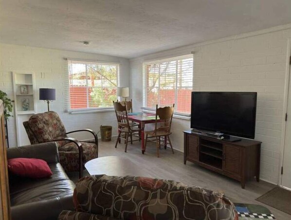 Living room has two upholstered chairs and loveseat. 1950’s coffee table and reading lamp. Big window looks out to native landscape and the Catalina mountains. A glass top table / computer workstation provides a pleasant work area. A Samsung smart TV and hand painted dining table painted in bright colors complete the room.