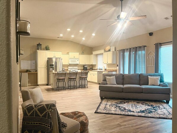 Enjoy the entire space all to yourself! This cozy 3 bedroom, 2 bathroom home located in a family-friendly neighborhood in the city of Tulare. The home comes equipped with all the essentials. Our kitchen is fully stocked with cooking tools and includes a dishwasher. The laundry room includes an in-unit washer and dryer with soap to use during your stay. The backyard includes a small covered patio with a table and chairs. There is a paved walking trail in the neighborhood which leads you to Starbucks, Taco Bell, The Curry Pizza Co., Subway, and a CVS Pharmacy. The home is a short drive to the World Ag Expo, Tulare Golf Course, and Tulare Outlet Shopping Center/Galaxy Movie Theatre. We look forward to hosting you!