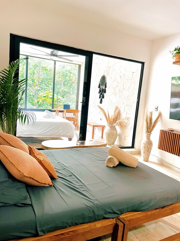 If you want to feel like a local in Tulum, this studio is just what you need. In just 10 minutes by car, you can reach the most beautiful beaches and tourist areas. Head the other way, and you’ll find yourself in La Veleta and Tulum downtown—two of the trendiest areas right now, full of restaurants and bars where you can chill and have a great time. You’ll be in the heart of the jungle living a peaceful and relaxing experience. After a day of exploring, you can relax in the pool surrounded by trees, work out in the gym, or enjoy the evening with a grill for a barbecue. At the condo, you can also rent a bike, scooter or car directly. The studio has everything you need: a super comfy king-size bed in the main bedroom and a living room with a sofa bed that turns into a second sleeping space. But what you'll love most is the big window that opens up completely, giving you a beautiful connection to the outdoors. Whether you’re working or relaxing, you’ll feel close to nature, and with high-speed internet, it’s great for remote work too. We’re absolutely in love with Tulum, and once you book with us, we’ll share all our favorite spots and must-do activities. You know that frustrating moment when you arrive at a place after picking it on Google Maps, only to realize you totally regret your choice? That won’t happen here! We’ve got everything sorted for you. From the best places to have brunch and dinner, to bars, tours and natural wonders you can't miss—basically, we’ll gift you a ready-made travel itinerary!