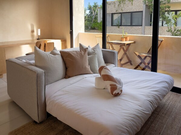 Filled with natural light this spacious 1 bedroom has soaring ceilings and windows looking out onto the jungle. A beautiful combination of modern architecture with natural Tulum finishes. Features flex living room with workspace and pull out sofa