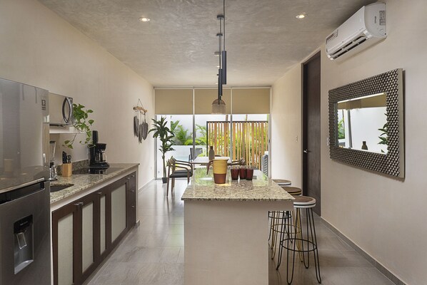 The kitchen has a beautiful granite island with stools. It is fully equipped with a stove, blender, microwave, refrigerator, electric kettle, and utensils.