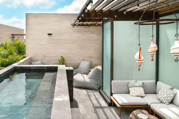 🏊‍♂️ The private pool on the second floor is the crown jewel of this penthouse, offering you an exclusive place to unwind and enjoy the sun. Whether you’re having a morning swim or a nighttime dip under the stars 🌌, this space is your personal sanctuary. Plus, the bedroom upstairs allows for an extra level of privacy and comfort, making it perfect for families or groups who want a balance of shared and private spaces.