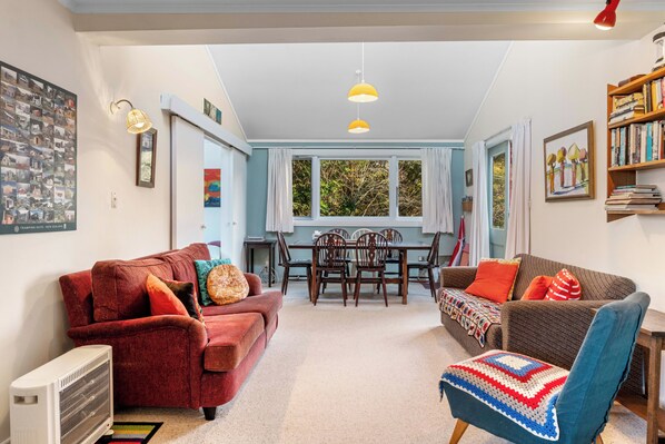 Singlee sleeps up to seven guests across three bedrooms. Bedroom one has a double bed; bedroom two has two singles; and bedroom three offers a double and a single bed and doubles as a rumpus room with beanbags, books, games, and its own heater.