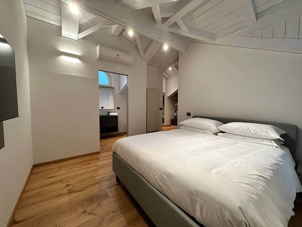 Dreizimmer-Dachwohnung von etwa hundert Quadratmetern im dritten und letzten Stock, ausgestattet mit einem Doppelzimmer mit eigenem Bad, einem Zimmer mit französischem Bett und eigenem Bad, einem Gästebad und einem großen Wohnzimmer mit offener Küche. Zwei kleine Terrassen mit herrlichem Blick auf das Schloss. Für maximal drei Gäste.