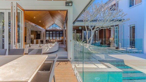 Keeping all age groups entertained, Santi House boasts a sparkling private pool for your splash-filled afternoons and secured garage space for six cars, a true rarity in beachfront properties.