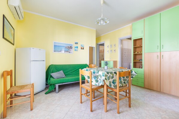 - After reservation, you can fix check-in (from 4pm to 8pm) and check-out (from 8.30 am to 10am). An extra payment of euro 50 is required for late check-in upon request (from 8pm to 12am). - Upon your arrival you will be required to sign the tourism contract written in Italian language. - The tourist tax, WHERE APPLICABLE,is not included in the price and will be applied according to the municipal regulations. - Bed linen/towels optional rental: price is euro 20 per person per week. - It is MANDATORY to sort and dispose the waste. If not, it will be withheld penalty fee of 80 euro for up to 10 kg of waste + 50 euro for each additional kg. - It is MANDATORY to leave the stove and cutlery clean (service not included in the price of final cleaning). If not, it will be withheld a penalty fee of 40 euro. - Shared external entrance with another apartment. - Air conditioning in the living room.