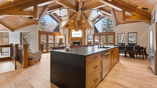 From the moment you walk in, this newly renovated home is designed to enhance your Vail experience. The entryway features a convenient mudroom, perfect for storing gear after a day of mountain adventures. The main floor hosts a bedroom with a queen bed and twin bunk bed, ideal for family or friends. The spacious, open-plan living area boasts a gourmet kitchen that’s fully equipped for cooking, and an elegant dining table for eight where you can gather to share meals.