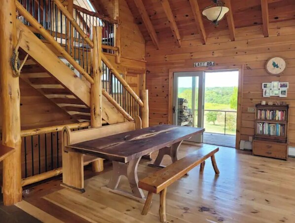 Experience tranquility solo or enjoy gatherings here. This gorgeous log home was built for panoramic views and to experience life off the beaten path. Once an operating farmette, the love poured into this space radiates. Surrounded by pine logs inside, you'll find unique features like a barn door honoring the homes' history, a "secret" hiding space, antiques and a handmade, black walnut table for gathering. Absorb yourself in the serenity of the space or venture out for hiking, wineries/breweries, amazing eateries, live music, theaters, museums and more in the nearby Finger Lakes region!