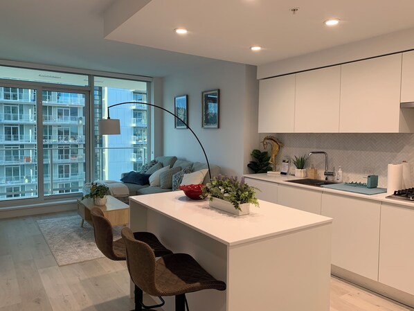 Alle Zimmer bei Fully Furnished Cozy 2-bedroom condo in Prime location Burnaby AC and gym access bieten Aufmerksamkeiten wie eine Klimaanlage sowie Ausstattungsmerkmale wie kostenloses WLAN und Kücheninseln.