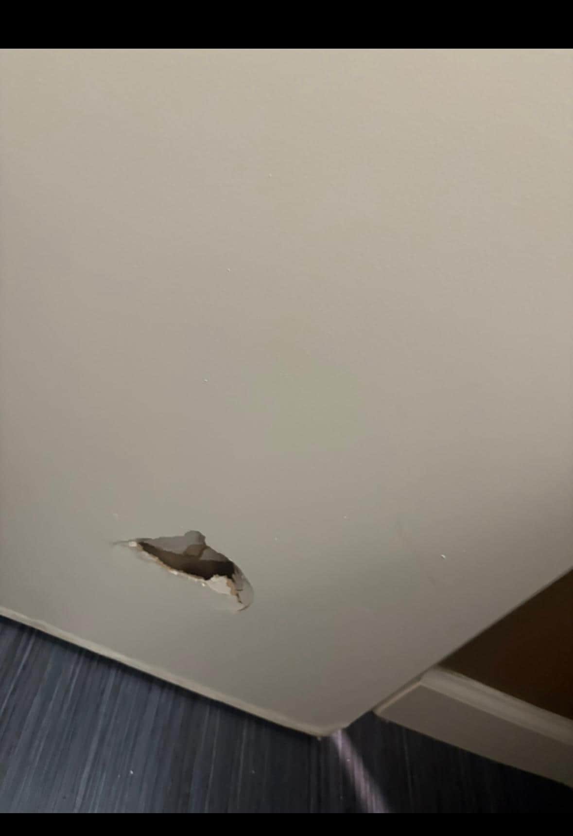 Badezimmerspiegel und Tapeten in die Jahre gekommen und beschädigt.