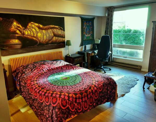 Quiet location with all you need. Fully stocked kitchen with an air fryer and bread machine, TV, piano and guitar for the musically inclined, two bedrooms, two full bathrooms, and walking distance to multiple transit lines and groceries. Plenty of art on the walls and a real fireplace to enjoy the winter.