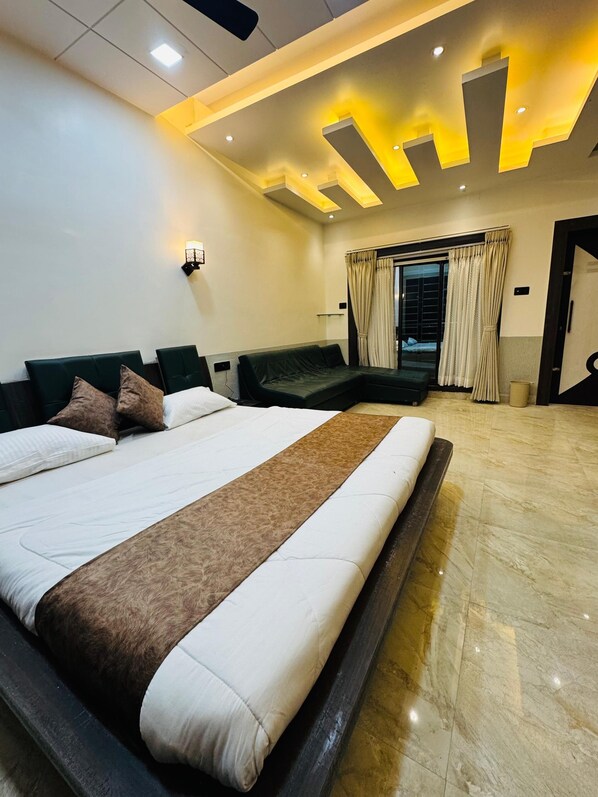 1 King-Bett, 1 Einzel-Schlafsofa und 2 Einzel-Futons