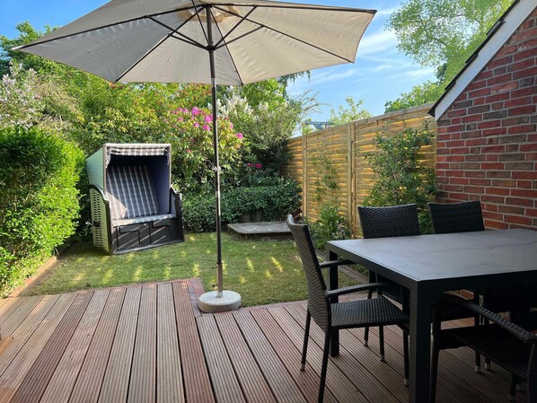 eigener Strandkorb,große überdachte Terrasse vor dem Wohnzimmer,Garten/Bollerwagen/Fahrräder/Spielzeug/Parkplatz vorm Haus/Waschmaschine/kostenloses W-LAN/Playstation4/HD-TV/Geschirrspüler/Kinderbett/ u.v.m