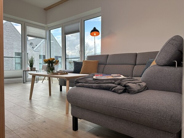 Die Ferienwohnung zeichnet sich durch eine umfangreiche Ausstattung aus, die einen sorgenfreien Aufenthalt garantiert. Der großzügige Wohnbereich mit Smart-TV, ein großer Essbereich sowie eine moderne Küche, ausgestattet mit Herd, Backofen, Mikrowelle und weiteren Annehmlichkeiten, laden zum gemeinsamen Kochen und Verweilen ein. Das moderne Badezimmer bietet neben Handtüchern, einem Föhn und Fliegengitter, um für jede Tageszeit und Jahreszeit den optimalen Komfort zu gewährleisten.
