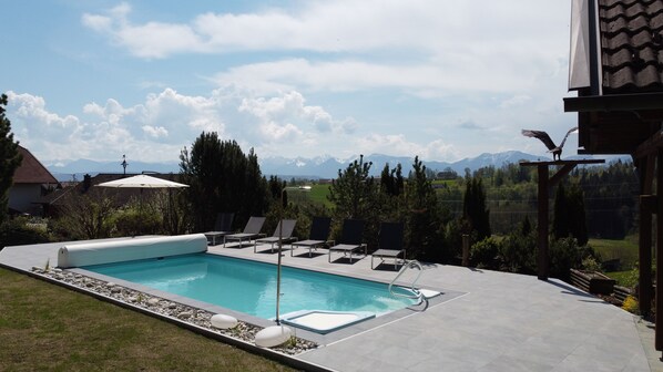Besonders eindrucksvoll ist daran anschließende, gemütliche Wohnzimmer mit dem originalen Hypokausten-Kachelofen (Selbstbeheizung), welcher nach individuellem Bedarf mit vorhandenen Holzscheiten angeheizt werden kann. Eine Jagdstube mit Holz-Wandvertäfelung und neu installiertem Kachelofen rundet das Erdgeschoss ab. Brennholz von Oktober bis April inklusive. Über das Wohnzimmer gelangt man auf den großen, umlaufenden Balkon mit verschiedenen Sitzgelegenheiten, von welchen man den überragenden Ausblick auf die Karawanken genießen kann. Über den Balkon hat man einen direkten Zugang zur Außenküche und im Sommer (ca. Mai bis Oktober) zum eigenen Pool. Jener kann optional mit einer Wärmepumpe beheizt werden.
