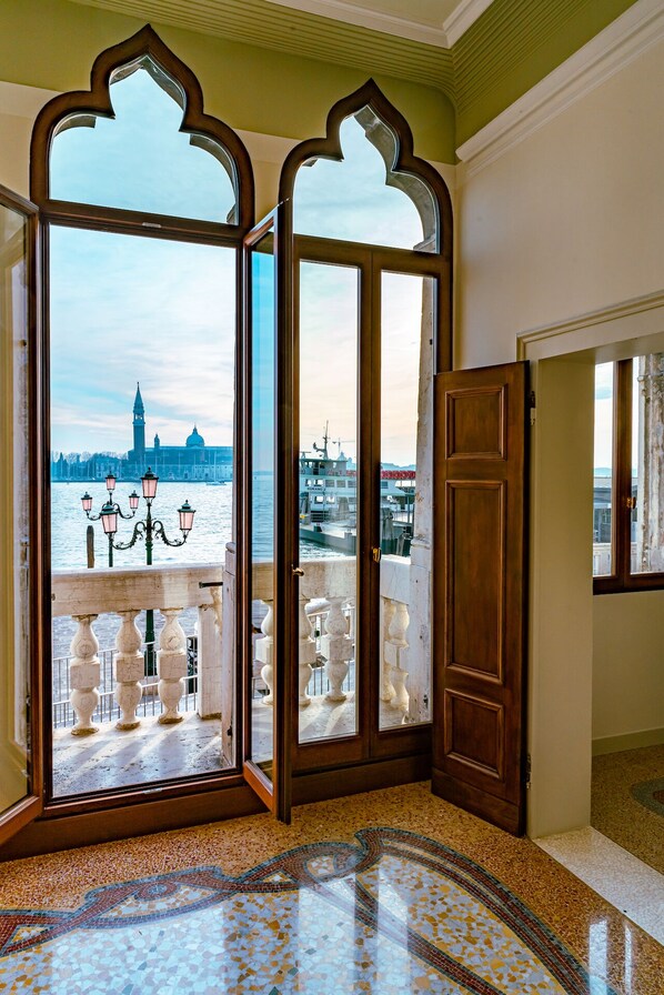 Ca‘ Navagero Riva – von der herrschaftlichen Etage des historischen Palazzos aus genießen Sie einen atemberaubenden Ausblick auf Venedig, auf Riva degli Schiavoni und Bacino S. Marco genau gegenüber der bezaubernden Insel S. Giorgio.