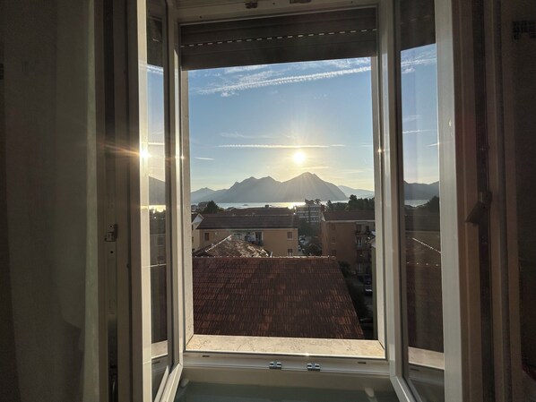 Upon entering, you can conveniently access the 5th floor via the elevator. The entrance opens centrally into a spacious and bright open space of 40 square meters, where your gaze extends 12 meters from one French door to another, overlooking two large balconies that provide natural ventilation, allowing you to enjoy the summer breeze while dining facing the opposite shore of the lake. Here, you can enjoy views of the mountains, the ferries arriving in Intra, or the sailboats gliding over the lake's waves. The kitchen is fully equipped and includes a coffee bar area with a peninsula, perfect for sipping an aperitif with friends while cooking. The living room is furnished with an elegant glass table and a comfortable sofa facing a 55’’ Smart TV.