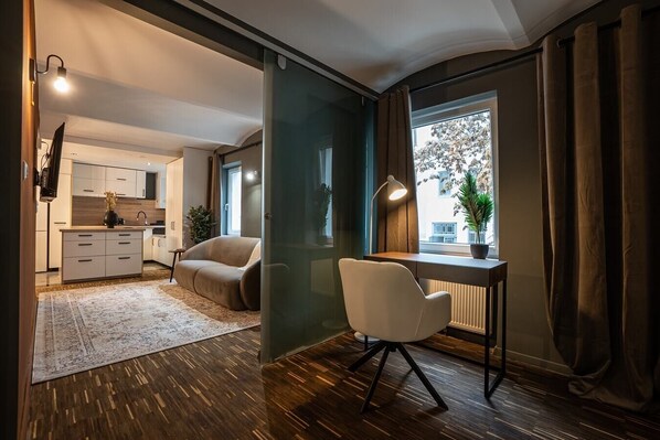 This place is equipped with everything you need to have a good time. Bright bathroom, hotel-quality bed lines, comfortable sofa and private working space, soft lights, calm neighbourhood — everything you expect to make your stay as pleasant as possible. The apartment is located on the first floor.