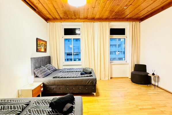 This spacious 4-bedroom apartment is thoughtfully designed to ensure a comfortable and convenient stay, making it an excellent choice for families, groups, or business travelers. Accommodating up to 12 guests, the first bedroom features a double bed and a sofa bed, providing space for up to 3 people. The second bedroom includes two double beds, comfortably sleeping up to 4 guests. The third bedroom is furnished with a double bed, perfect for 2 people, while the fourth bedroom offers a queen bed and a sofa bed, accommodating up to 3 guests. Each room also includes a clothes rack for convenient storage, ensuring a clutter-free and relaxing environment. The high-quality mattresses and soft linens promise restful nights, while the tasteful decor creates a warm and inviting ambiance that feels like home.