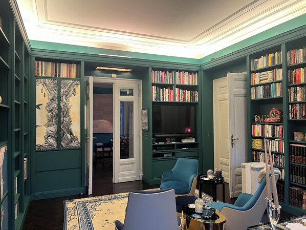 Die geschmackvoll eingerichtete Bibliothek mit ihren deckenhohen, grünen Bücherregalen, bequemen Designer-Sesseln, einem eleganten Schreibtisch und kuratierten Kunstwerken ist ein Ort der Inspiration und entspannter Atmosphäre. Ob zum Arbeiten, Lesen oder Reflektieren – dieser Raum bietet die ideale Balance zwischen Funktion und Ästhetik.