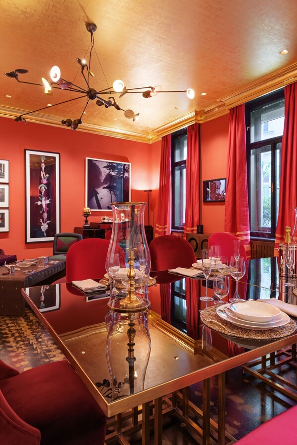 Der Speisesalon ist ein visuelles und gesellschaftliches Highlight. Zwei große Tische mit glänzenden Glasoberflächen bieten Platz für bis zu 8 Gäste. Tiefrote Samtstühle, eine vergoldete Decke mit Stuckelementen sowie abstrakte Gemälde und surrealistische Fotografien verleihen dem Raum künstlerische Tiefe und eine festliche Aura. Perfekt für private Dinner, Executive Meetings oder kleinere Events. Ein eleganter Sitzbereich aus einem tiefvioletten Sofa, das von mehreren farbenfrohen Kissen (Pink, Grün, Blau) ergänzt wird, lädt zum Entspannen ein. Zwei elegante Sessel in kräftigen Farben wie Türkis und Rot bieten zusätzliche Sitzmöglichkeiten in diesem Wohnbereich des Salons.