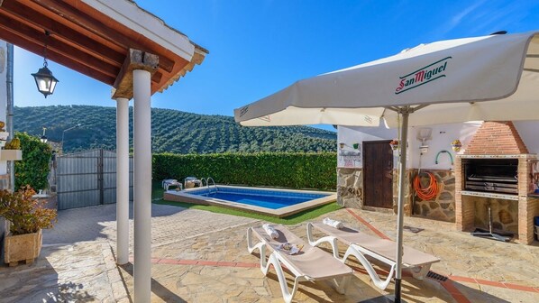 Der Außenbereich verfügt über eine überdachte Veranda mit einem geräumigen Essbereich. daneben steht ein weiteres Badezimmer mit Dusche für die Gäste zur Verfügung. Der Rest der Terrasse begrüßt einen privaten Pool, ein paar Liegestühle, wo Sie sich sonnen können, so viel Sie wollen, und einen gemauerten Grill, um einige leckere Köstlichkeiten zubereiten, um den Gaumen Ihrer Familie zu überraschen.