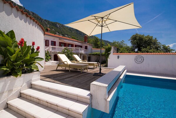 Der Aussenbereich ist sehr liebevoll gestaltet. Neben dem 32 m²großen Swimmingpool befinden sich 6 Sonnenliegen und Sitzgarnituren für alle Personen.