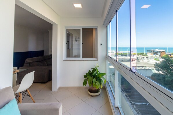 Bedroom 1 is the suite — double bed, air conditioning and an enclosed balcony with views over the city and green area. Bedroom 2 has a double bed, wardrobe and balcony with a sea view — natural ventilation and a ceiling fan complete the comfort. Air dehumidifiers in both bedrooms.