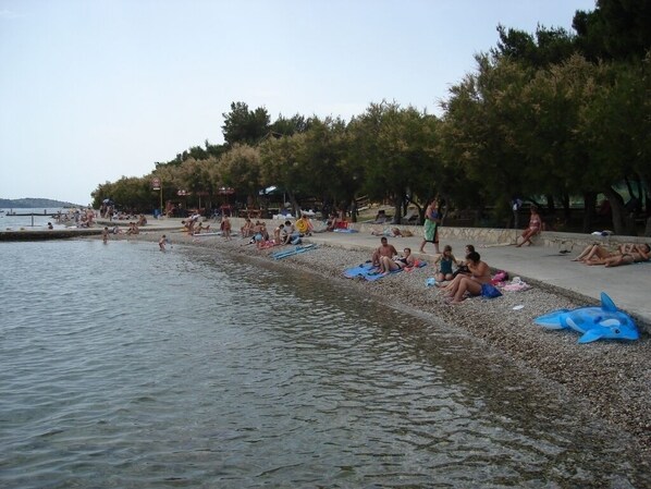 Die Wohnung liegt nur etwa 450 Meter vom Kiesstrand entfernt, an dem unbeschwerte Stunden am Meer möglich sind. Restaurants, Cafés, ein Supermarkt und diverse Freizeitmöglichkeiten erreichen Sie in wenigen Gehminuten. Vodice selbst bietet eine malerische Altstadt, kulturelle Angebote und ein lebendiges Freizeitprogramm für Jung und Alt. Wassersport, Radfahren, Wandern und Bootsfahrten sind beliebte Aktivitäten in der Umgebung, während Nationalparks, historische Sehenswürdigkeiten und lokale Weingüter zu Ausflügen einladen.