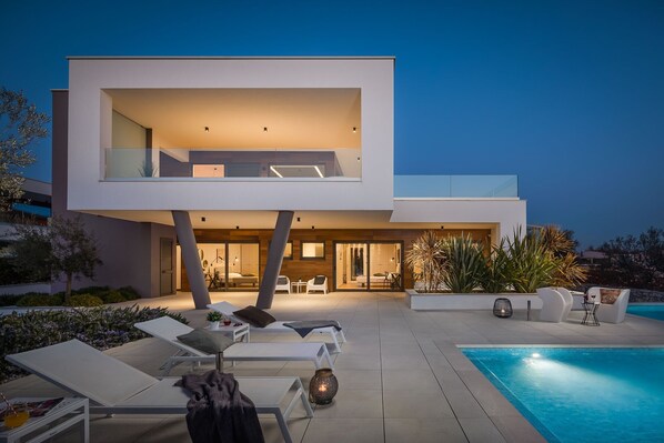 Die Villa Old Olive Prima erstreckt sich über 3 Ebenen und nimmt 500 m2 des Wohngebiets ein. Das Erdgeschoss ist das Obergeschoss. Es verfügt über ein Hauptschlafzimmer mit einem Kingsize-Bett, einen begehbaren Kleiderschrank und ein eigenes Bad mit Badewanne und Dusche. Darüber hinaus verfügt das Obergeschoss über eine offene Wohnzone mit einer voll ausgestatteten Küche, einem Essbereich und einem Wohnzimmer. Es gibt auch eine zusätzliche Toilette auf dieser Etage. Der Wohnbereich öffnet sich zur großen Terrasse mit einem Esstisch im Freien und Sitzgelegenheiten in der Lounge. Von hier aus genießen Sie einen Blick auf das Meer und den Brijuni-Archipel.