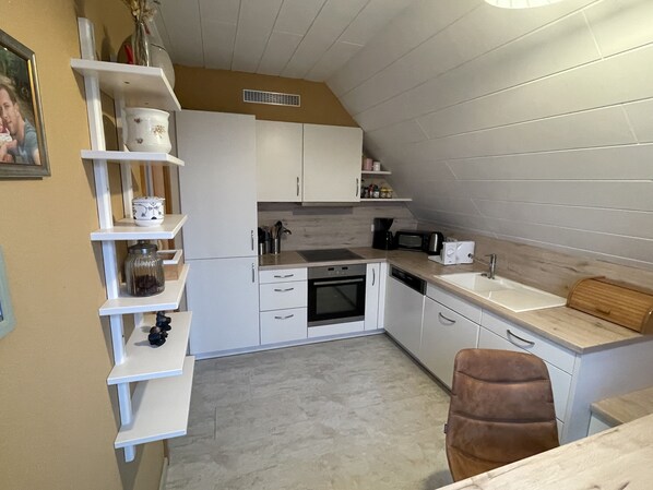 Die Küchenzeile ist mit einem E-Herd, einem Gefrierschrank, einem Geschirrspüler, einem Kühlschrank, einem Backofen, einem Wasserkocher und einer Kaffeemaschine ausgestattet. Geschirr ist ebenfalls reichlich vorhanden.