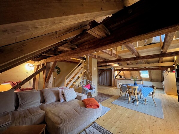 Entdecke das Besondere! Willkommen im "Dach-Traum", einem Ort mit Seele - zum Ankommen und Durchatmen. Das liebevoll ausgebaute Maisonette im Dachgebälk schafft mit Naturmaterialien wie Lehm und Holz ein gesundes Raumklima. Genieße die warmen Holz-Töne und eine Atmosphäre, die sofort entschleunigt. Ideal für alle, die Ruhe, Natürlichkeit und ein Stück Erdung über den Dächern suchen. Das Haus liegt mitten im Ortskern von Waal, unweit von Schloss und Dorfplatz mit Dorfladen, direkt am plätschernden Bächlein Singold. Über eine Außentreppe gelangen Sie zum überdachten Balkon und von hier geht's in die Wohnung. Treten Sie ein! Die Diele aus Naturstein- und Holzboden empfängt Sie. Das angrenzende Bad hat WC, Dusche und Badewanne (Haartrockner vorhanden). Hier unten befindet sich auch das 1. Schlafzimmer mit Boxspringbett (180 x 200) Weiter führt die alte Original-Schulhaus-Schwingtür ins großzügige Wohnzimmer. Gemütliche Kuschelecken laden zum Lümmeln, Lesen und Relaxen ein. Der Küchenbereich ist offen und bietet Gasherd, Backofen, Kühlschrank, Spülmaschine, Kaffeemaschine inkl. Kaffee (Grundausstattung), Toaster, Wasserkocher etc.. Über eine Holztreppe gelangen Sie auf die Galerie und von dort aus ins 2. Schlafzimmer, ebenfalls mit Doppelbett (180 x 200). Sollte ein Schlafplätzchen für eine 5. Person benötigt werden, kann die große Couch im Wohnzimmer zum Schlafen verwendet werden. Der Ort Waal wird Sie mit seinem Charme leicht überzeugen und für welche Aktivitäten Sie sich von hier aus auch entscheiden: Radeln oder Wandern im Allgäu, Langlaufen im Ostallgäu, Baden im Ammersee, Städtetouren nach Landsberg, Füssen oder München, Sie kehren am Abend beseelt in Ihr Domizil zurück. 2 Parkplätze sind übrigens im hauseigenen Hof vorhanden.
