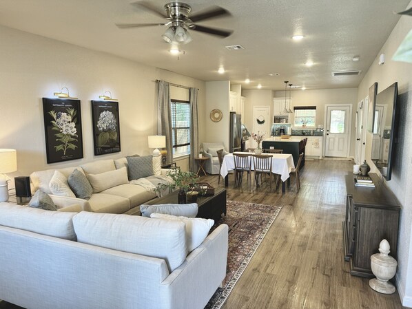 Magnolia market 0.7 miles, Baylor University 1.1 miles, the historic Waco Suspension Bridge 1.7 miles, Cameron Park Zoo 2.1 miles, and Waco Surf 9.4 miles. The kitchen is fully stocked with everything you need to make wonderful meals (Joanna Gaines cookbook is provided!). The living room has a 75” smart tv, books and games, and big comfy couches for relaxing. The primary bedroom features an en-suite bathroom and a 75” smart tv. The two guest bedrooms each have queen beds and 65” smart tvs, while the guest bathroom has a full shower/tub combo. The large, private backyard is perfect for little ones to run and play, and the covered patio is ideal for hanging out while barbecuing on the grill, and enjoying the gas firepit!